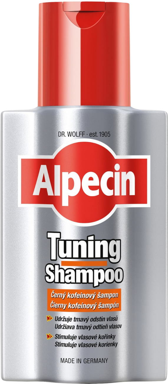 Alpecin Shampoo Tuning 200 ml Udržuje tmavé vlasy tmavé a vďaka obsiahnutému kofeínovému komplexu zabraňuje dedične podmienenému vypadávaniu vlasov. Intenzívne pigmenty oživujúce prirodzený odtieň tmavých vlasov a zmatňujú prvé šediny.