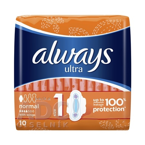 Charakteristika: ALWAYS ULTRA NORMAL PLUS poskytujú bezpečnú a diskrétnu ochranu po celý menštruačný cyklus. Špeciálne ultra-absorbčné jadro obsahuje materiál, ktorý môže absorbovať a izolovať množstvo tekutiny niekoľko krát väčšie než je jej objem. Tento materiál transformuje vlhkosť na gél, aby sa zabránilo preniknutiu tekutiny späť na povrch. 4 krídelká s adhezívnou vrstvou, ktorá drží vložku na jej mieste aj keď je telo v aktívnom pohybe. Sú vhodné pri normálnej menštruácii.