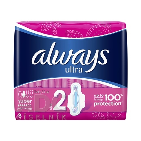 Charakteristika: ALWAYS ULTRA SUPER PLUS poskytujú bezpečnú a diskrétnu ochranu po celý menštruačný cyklus. Špeciálne ultra-absorbčné jadro obsahuje materiál, ktorý môže absorbovať a izolovať množstvo tekutiny niekoľko krát väčšie než je jej objem. Tento materiál transformuje vlhkosť na gél, aby sa zabránilo preniknutiu tekutiny späť na povrch. 4 krídelká s adhezívnou vrstvou, ktorá drží vložku na jej mieste aj keď je telo v aktívnom pohybe. Poskytuje ochranu pri silnejšom výtoku v prvých dňoch.