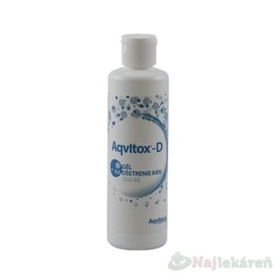 AQVITOX-D gél obsahuje aktívny chlór – zmes kyseliny chlórnej a chlórnanu sodného (< 0,05%), chlórdioxid, chloridy. Bezfarebný gél so slabým zápachom chlóru. Gel s aplikátorom na ošetrenie rán: povrchové a tiež hĺbkovo pôsobiace antiseptikum, na zvlhčenie a podporu hojenia rán, na kožné a slizničné defekty, napomáha znižovať osídlenie rany mikroorganizmami a odstrániť zápal z postihnutého miesta. Príbalový leták Aqvitox gél na ošetrenie rán