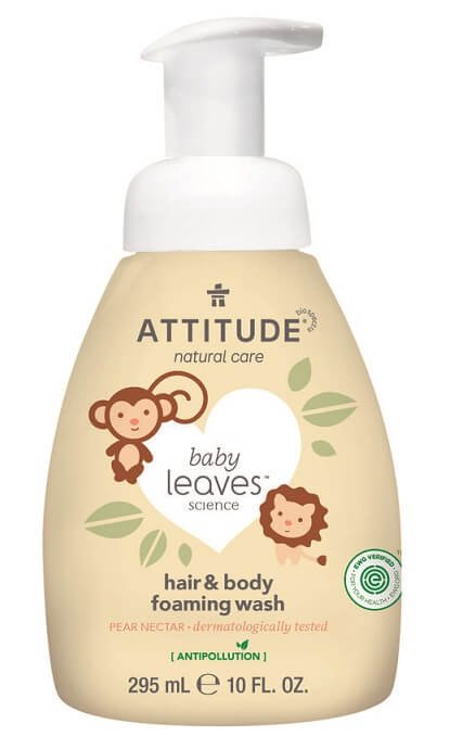 Attitude Baby Leaves Detská sprchová pena (2v1) s vôňou hruškovej šťavy 295 ml Prírodný, certifikovaný, hypoalergénny a penivý šampón a telové mydlo pre našich najmenších v jednom.