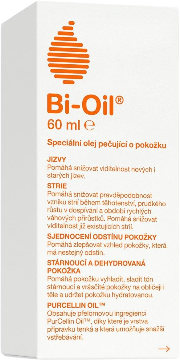 Bi-Oil Starostlivosť o pokožku 60 ml Olej – špecialista v starostlivosti o pokožku na jazvy, strie, zjednotenie odtieňa pokožky, starnúcu pokožku a dehydrovanú pokožku. Obsahuje ingredienciu Purcellin oil a tiež vitamíny A a E, olej z nechtíka, levandule, rozmarínu a harmančeka.