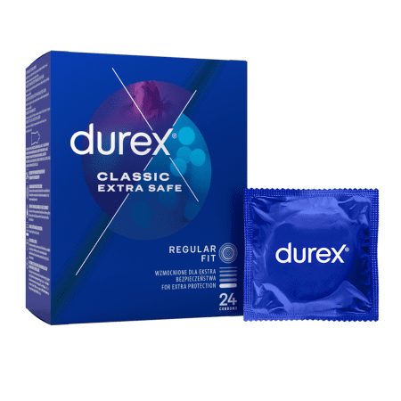 Durex Extra Safe sú extra lubrikované, hrubšie prezervatívy s tvarom Easy-On pre väčší komfort. Priehľadné prezervatívy z prírodného kaučukového latexu. Regular fit.