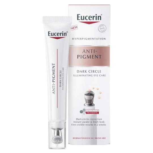 Eucerin Anti-Pigment Rozjasňujúca starostlivosť proti tmavým kruhom pod očami kombinuje účinné aktívne látky, ktoré pôsobia v rôznych smeroch, aby rozžiarili vašu pleť a redukovali hyperpigmentáciu. Prípravok tak rozžiari a vyhladí očné okolie priamo pri zdroji. Svieži, ľahký krém obsahuje thiamidol, účinnú a patentovanú zložku, ktorá sa zameriava na príčinu hyperpigmentácie, pretože znižuje produkciu melanínu. Pigmenty odrážajúce svetlo rozjasnia očné okolie a zaistia vám okamžitý svieži a žiarivý vzhľad. Kyselina hyalurónová zmierňuje opuchy a vyhladzuje jemné vrásky. Oligopeptidy stimulujú vlastné kolagénové vlákna v pleti, čím pomáhajú dosiahnuť jej pevnejšiu štruktúru.