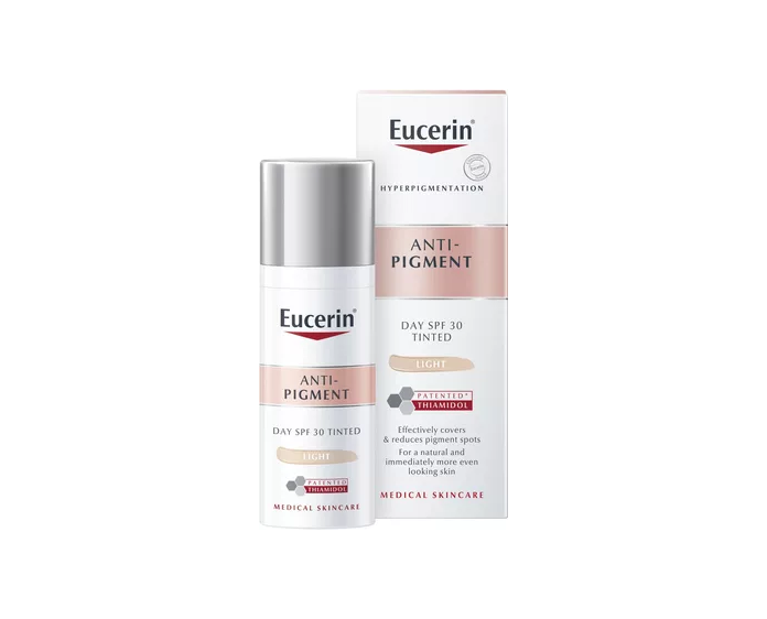 Eucerin Anti-Pigment Denný krém SPF 30 tónovaný svetlý obsahuje thiamidol, účinnú a patentovanú zložku, ktorá pôsobí na základnú príčinu hyperpigmentácie znížením tvorby melanínu. Klinické a dermatologické testy preukázali, že redukuje tmavé škvrny a bráni ich opakovanému výskytu. Prvé výsledky sú viditeľné po dvoch týždňoch a pri pravidelnom používaní sa ďalej zlepšujú.