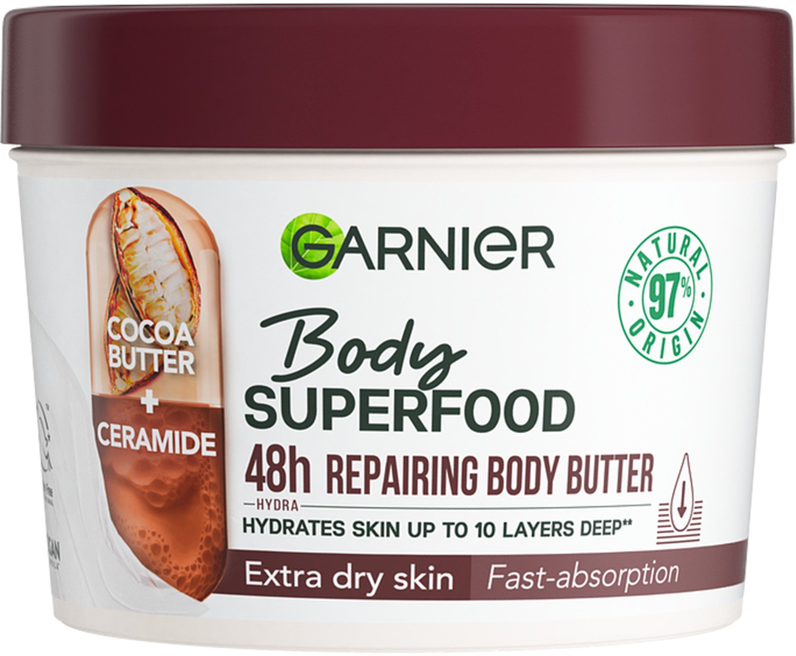 Garnier Body Superfood Cocoa telový krém s kakaovým maslom 380 ml Telové maslo Superfood s kakaom má príjemnú, sviežu a ľahkú textúru. Starostlivosť vhodná na citlivú pokožku poskytuje až 48 hodín hydratácie.