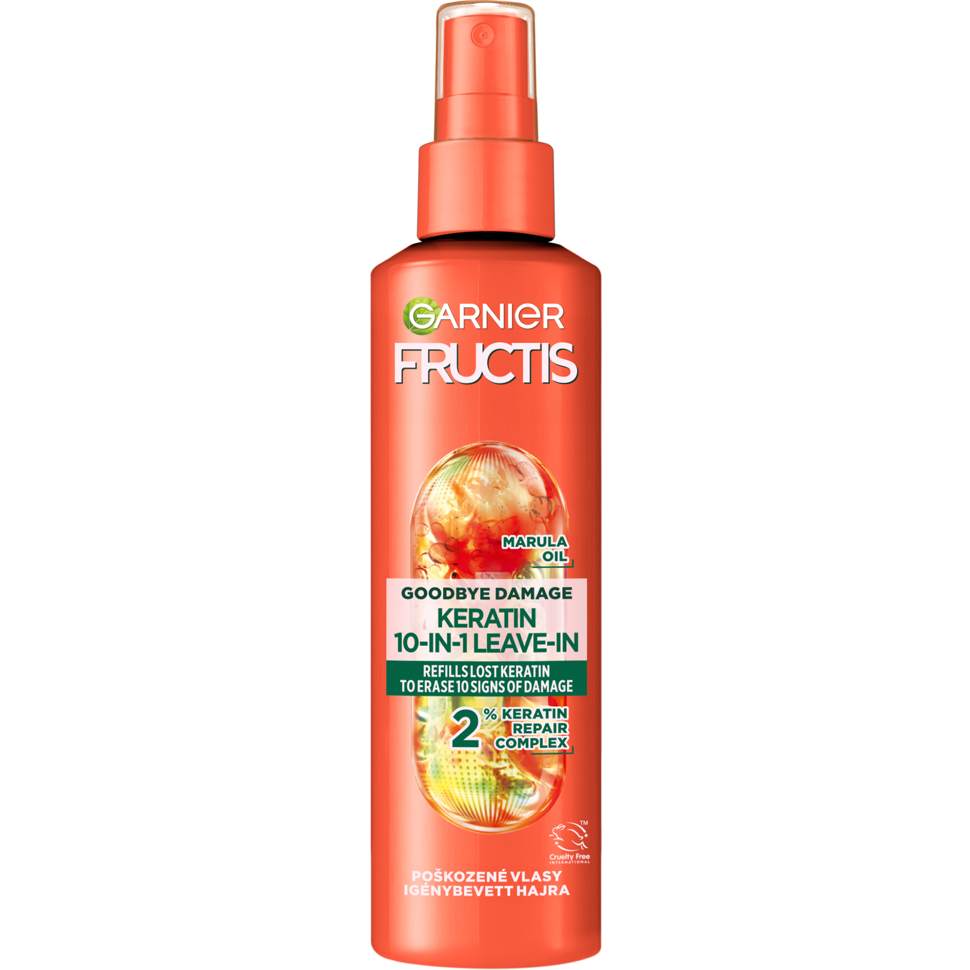 Garnier Fructis Goodbye Damage bezoplachový sprej 10 v 1 s keratínom, 150 ml Bezoplachový sprej 10 v 1 obohatený o tekutý rastlinný keratín a amla olej pomáha regenerovať a intenzívne vyživiť vlasové vlákno.