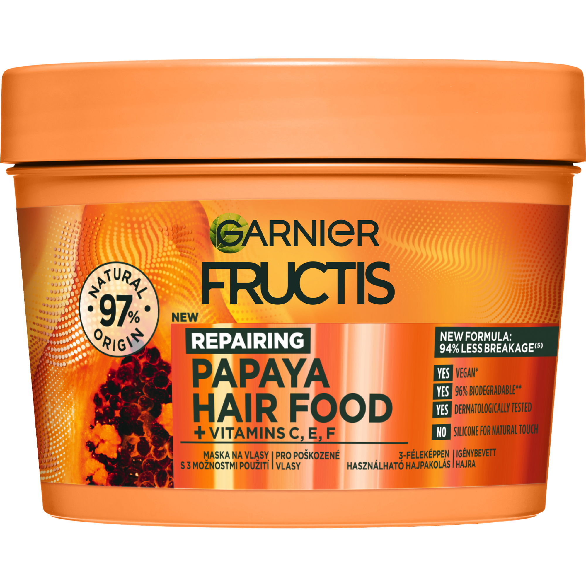 Garnier Fructis Hair Food papaya maska na vlasy, 400 ml Maska na poškodené vlasy obohatená o vitamíny C, E a F s 3 možnosťami použitia.