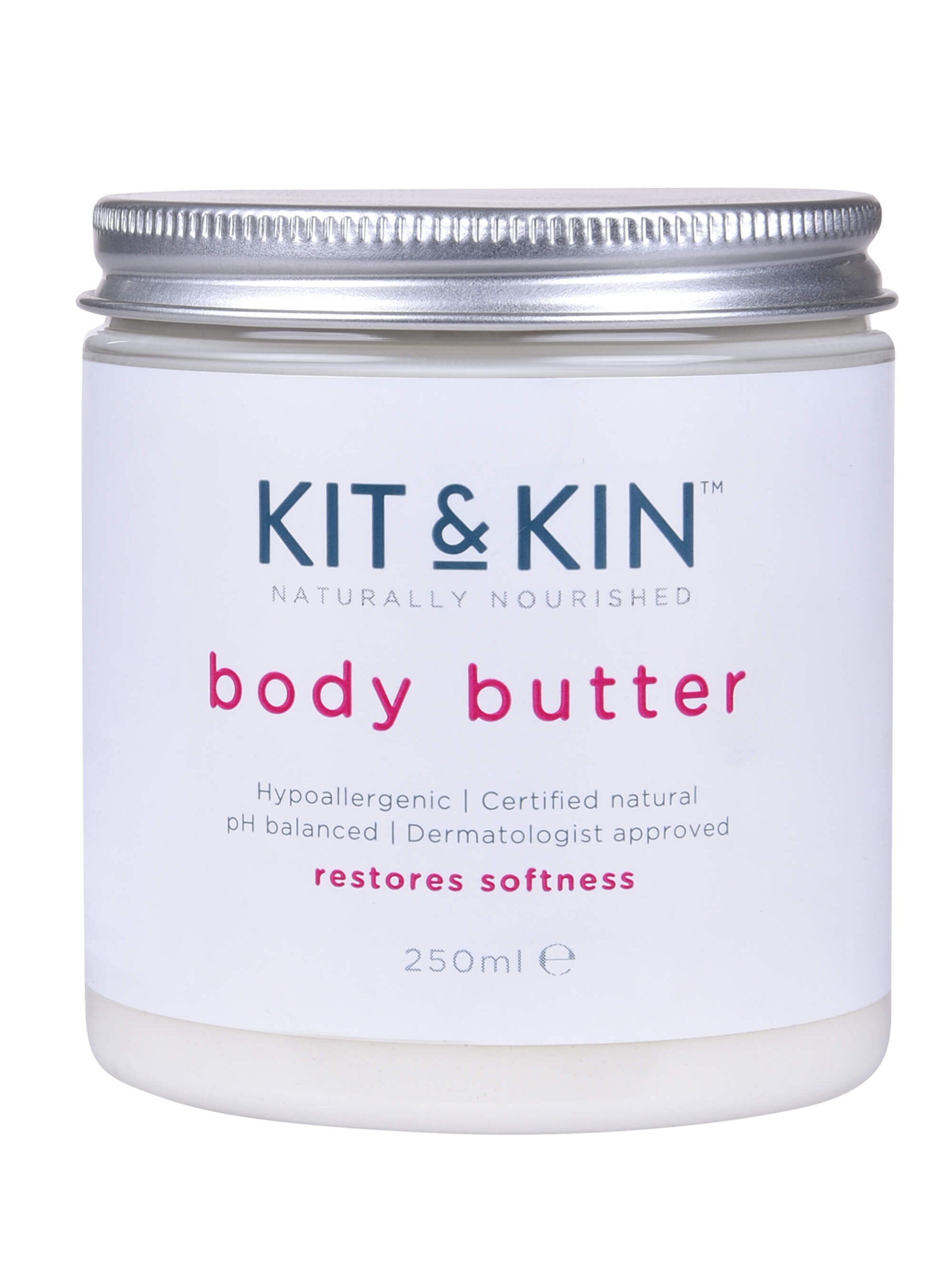 Kit & Kin Telové maslo 250 ml Tělové máslo Kit & Kin je výživné, hypoalergenní, přírodní a má vyrovnané pH. Obsahuje směs přirozeně vyživujících másel a olejů, snadno se vstřebává a bude o vaši suchou a citlivou pleť nejen pečovat a hojit ji, ale rovněž ji bude hydratovat a zanechá ji neuvěřitelně hebkou.