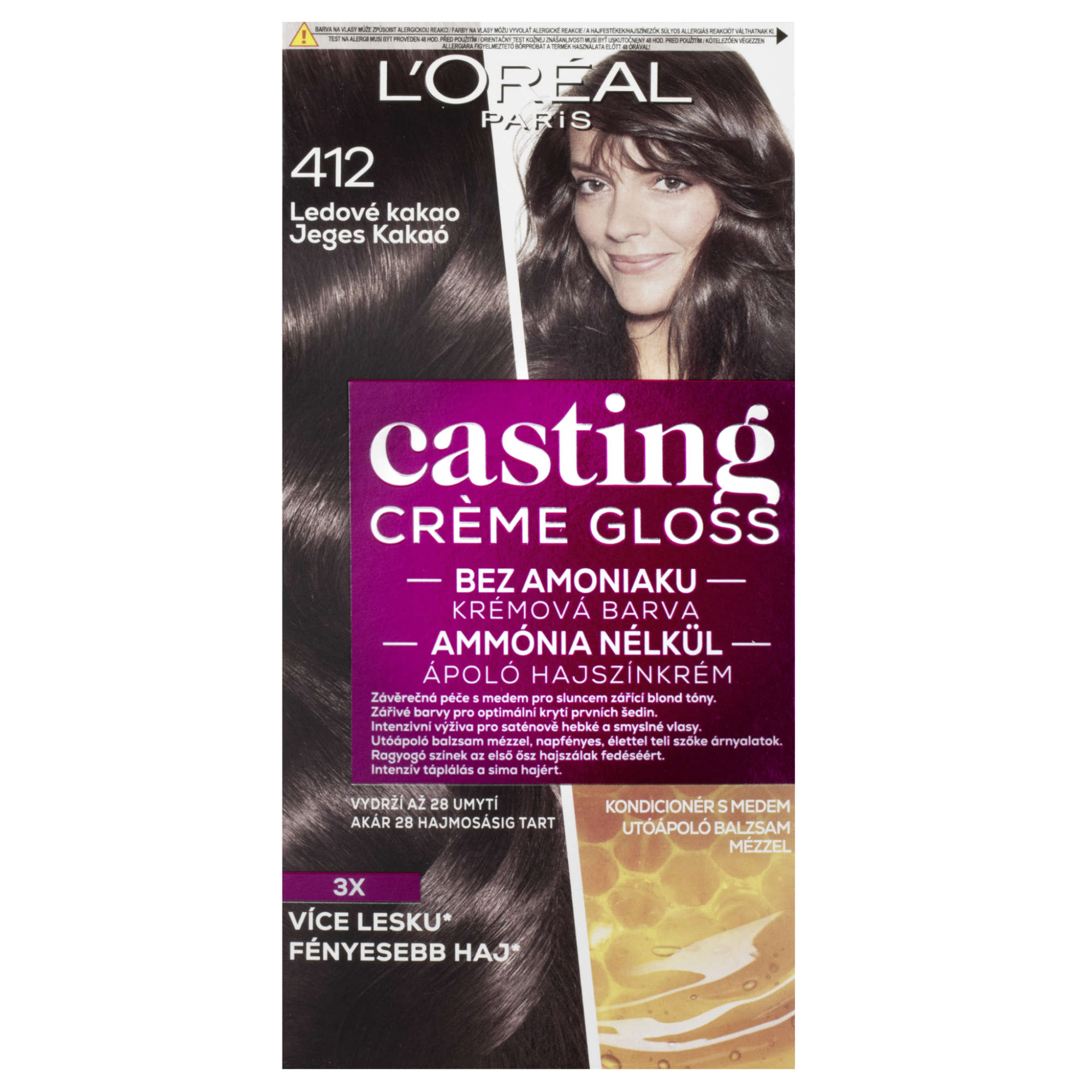 L'Oréal Paris Farba na vlasy Casting Crème Gloss 412 Ledové kakao Semipermanentná farba na vlasy Casting Crème Gloss ponúka šetrný spôsob, ako dosiahnuť prirodzenú a žiarivú farbu.