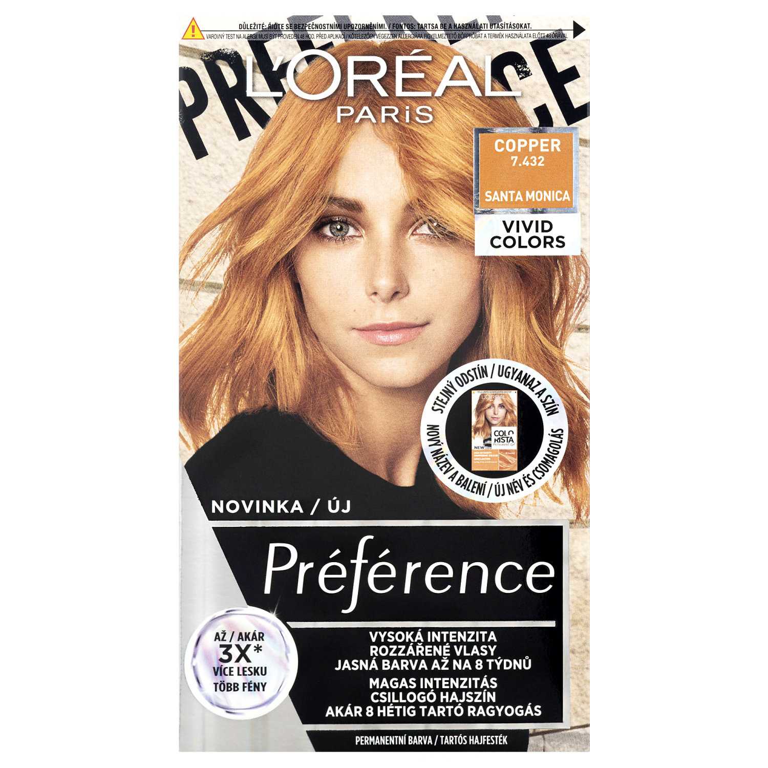 L'Oréal Paris Préférence Vivid Colors permanentná farba vlasov 7.432 Santa Monica 150 ml Permanentná farba pre žiarivý výsledok s vysokou intenzitou. Vytvorená pre všetky typy vlasov.