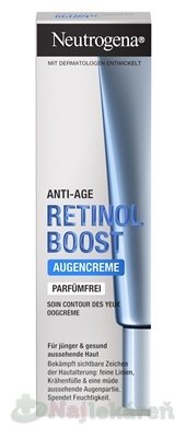 Neutrogena Retinol Boost Očný krém s čistým retinolom, vysoko účinnou látkou, ktorá urýchľuje produkciu kolagénu a obnovu pleťových buniek, bojuje proti jemným linkám a vejárom v okolí očí, pleť hydratuje a dodáva jej rozjasnený vzhľad. Pre pleť mladšiu & zdravú na pohľad.