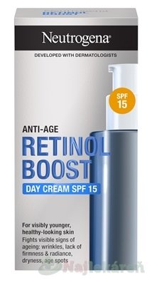 Denný pleťový krém proti vráskam Neutrogena Retinol Boost s OF 15 a čistým retinolom, mimoriadne účinnou látkou, ktorá urýchľuje produkciu kolagénu a obnovu buniek na povrchu pokožky, bojuje proti vráskam a strate pevnosti pleti. Zároveň pleť hydratuje a pôsobí proti pigmentovým škvrnám. Jedinečná receptúra krému kombinuje čistý retinol, rastlinný výťažok z myrty na zvýšenie účinkov retinolu a kyselinu hyalurónovú, ktorá pleť zvlhčuje a vypĺňa jemné vrásky. Vďaka ochrannému faktoru 15 je vaša pleť chránená pred negatívnym vplyvom UV žiarenia