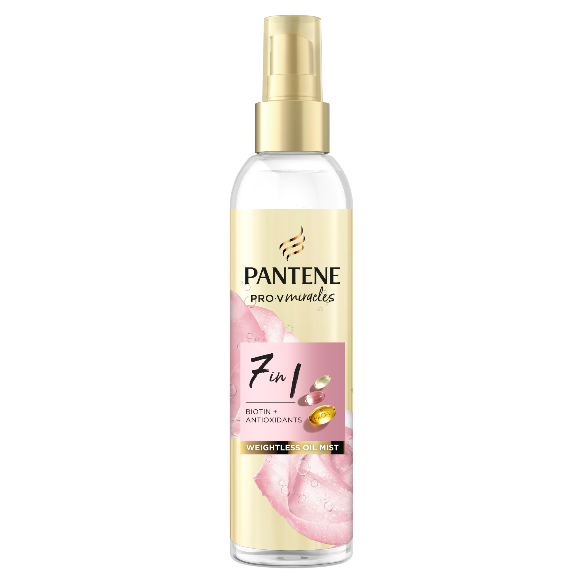 Pantene Pro-V Miracles 7v1 Weightless Oil Mist, Vlasový olej ve spreji s Biotinem 145 ml Pantene 7v1 Bezváhový olej na vlasy v spreji s biotínom posilňuje a chráni vlasy pred poškodením spôsobeným stylingom, štiepením končekov a krepovatením. Svieža vôňa.
