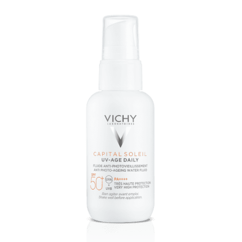 Denný krém proti fotostarnutiu SPF50+ s termálnou vodou vulkanického pôvodu, probiotickými frakciami, peptidmi a niacínamidom.