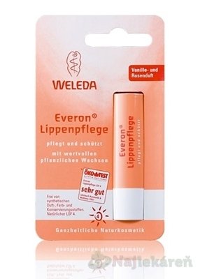 WELEDA Everon – tyčinka na pery s obsahom prírodných voskov a výťažkov napr. jojóbového oleja, včelieho vosku, výťažku z vanilky a ruže damašskej: